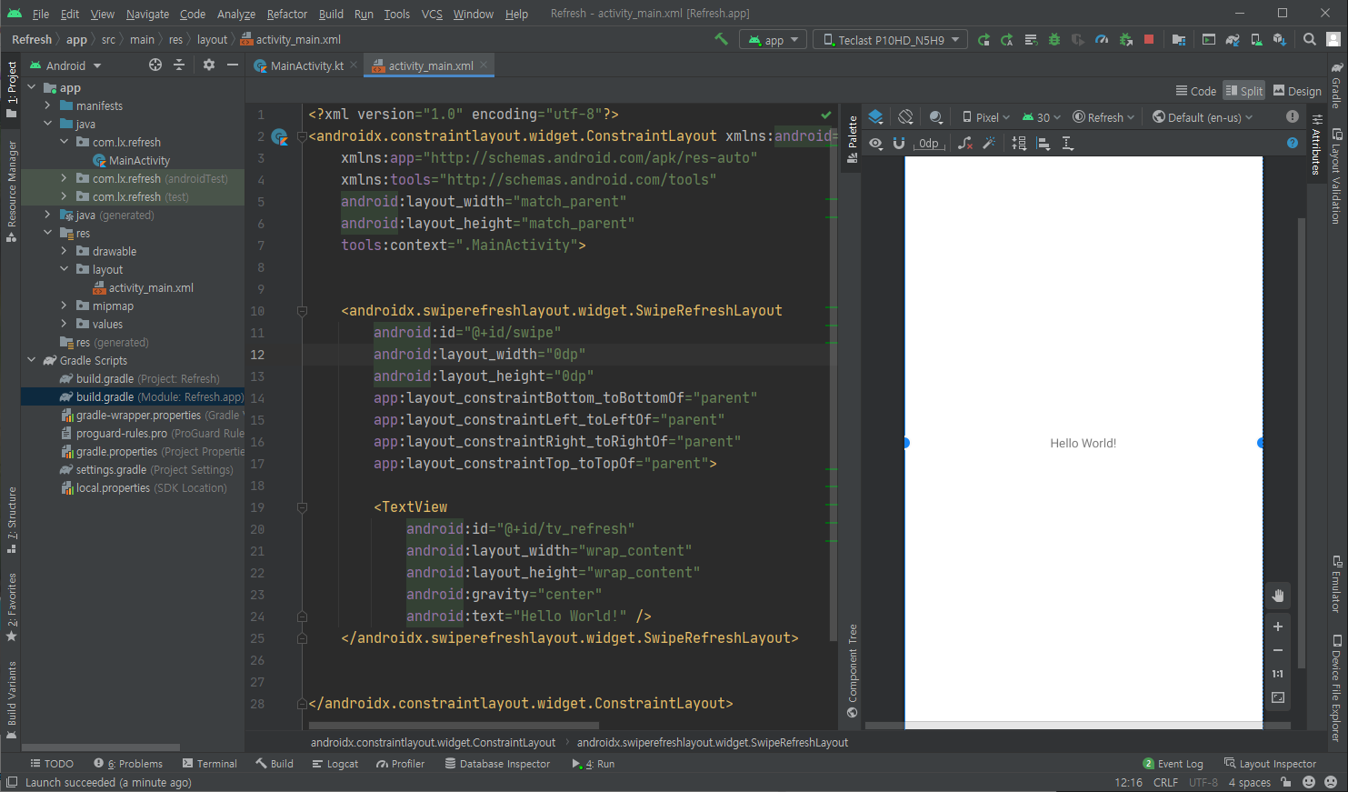 2. 메인액티비티 화면 레이아웃에서 SwipeRefreshLayout으로 갱신할 대상을 감싸줍니다.