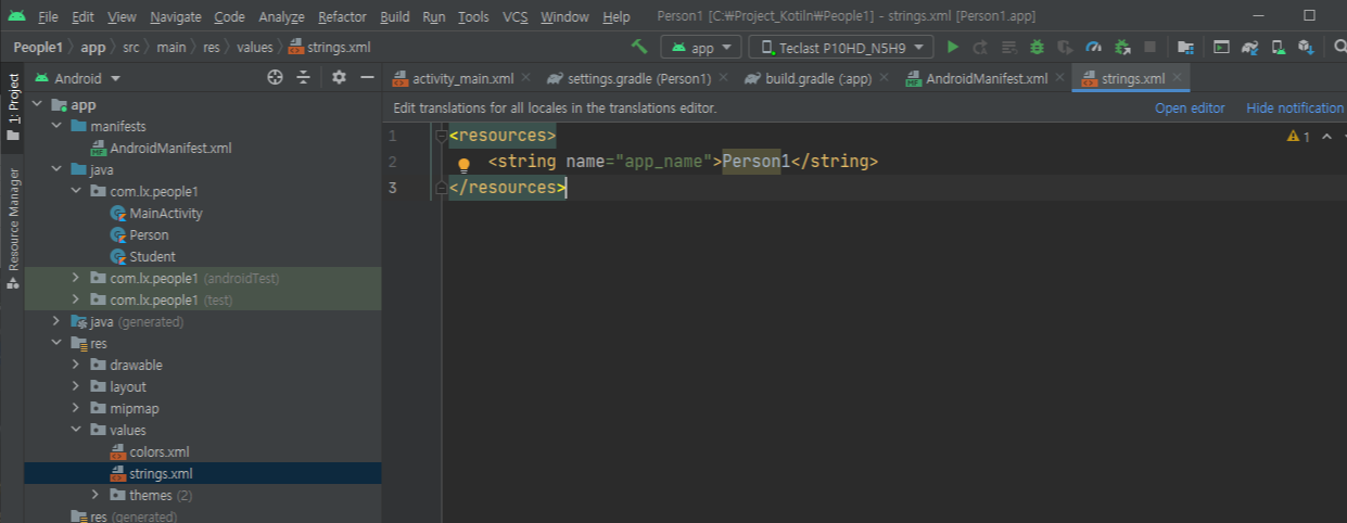 6. 마지막으로 res-> values -> strings.xml 에서 string name="app_name">Person1 을 People1로 바꿔줍니다.